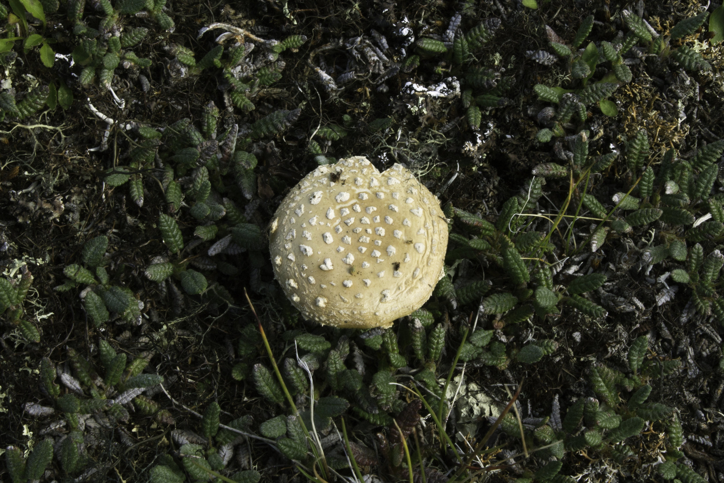 Rested up and ready to go, we woke up the next day and decided to do a little exploring around the area. We’d read about Circle, a tiny town not far from the Arctic Circle, but had received unenthusiastic reviews about driving up there (mainly, people didn’t seem to be sure if it was worth the effort). The Steese Highway up to Circle begins as a winding road through tree-covered mountains, passing by a few historic gold rush sites. It’s striking in its desolation, then turns to a decently maintained gravel road that climbs into the tundra. We made a brief stop at Mile 107, where there’s a trail up to Eagle Summit, then continued up the road a little. We happened to notice an even rougher side road that led up, and—hoping for the best—took that up to the top. Amazing. Up there, you really feel like you’re on the edge of the world, surrounded by nothing, the ground laden with low, tundra vegetation, spiky little purple bellflowers and bizarre mushrooms. We climbed to the top of some of the rocky outcroppings for a better view.